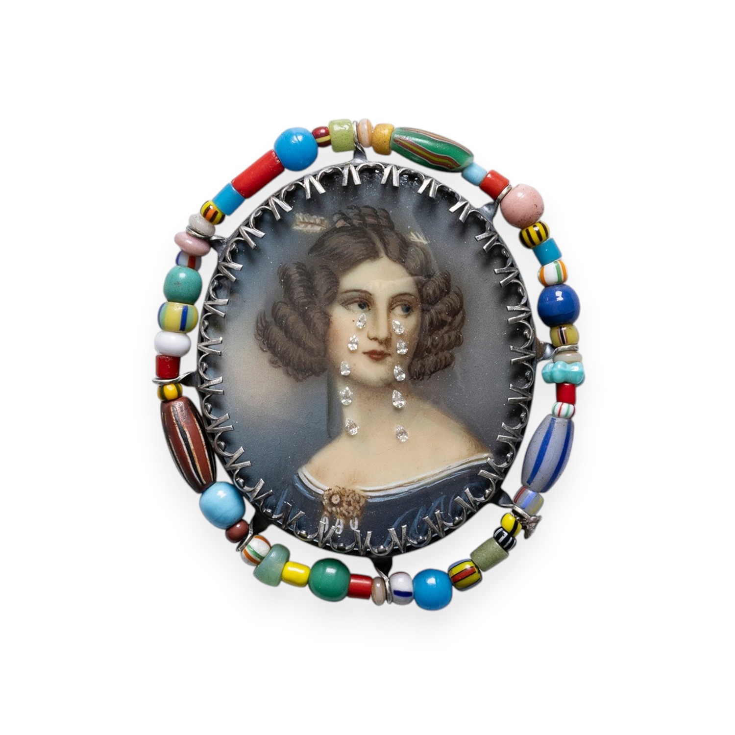 79 x 68 x 12 mm, argent, portrait peint vintage, diamants de synthèse, étain imprimé, verre, perles de verre de troc, monture en acier