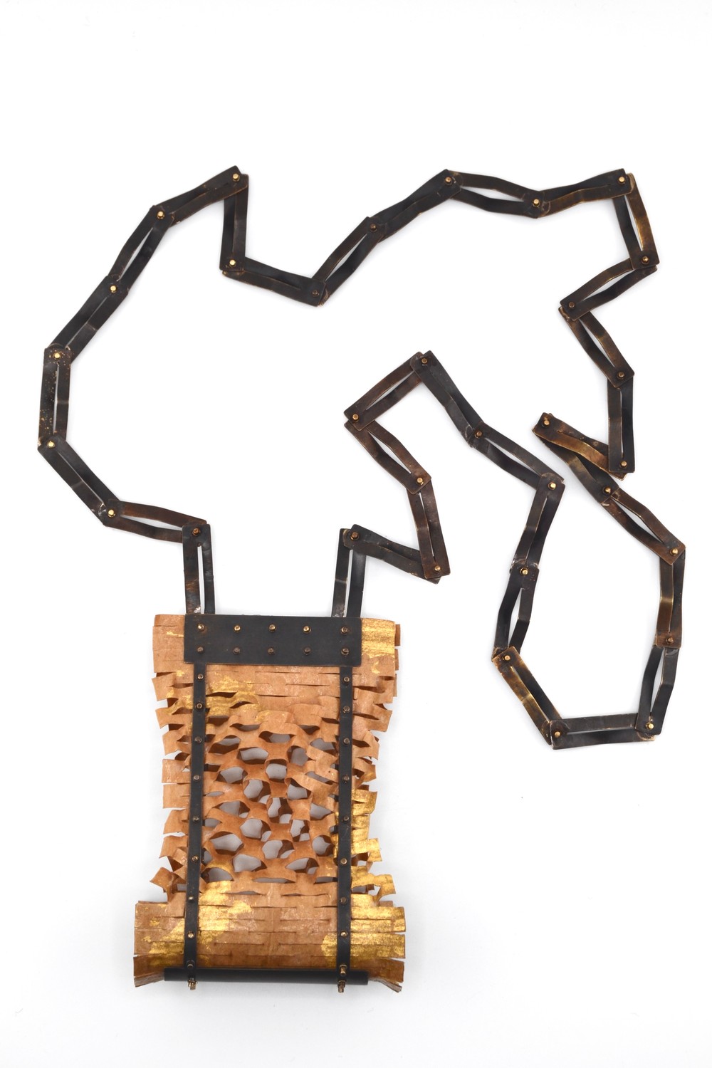 Olalla Fernández – Collier – Laiton – Patine – Papier recyclé – Feuille d’or